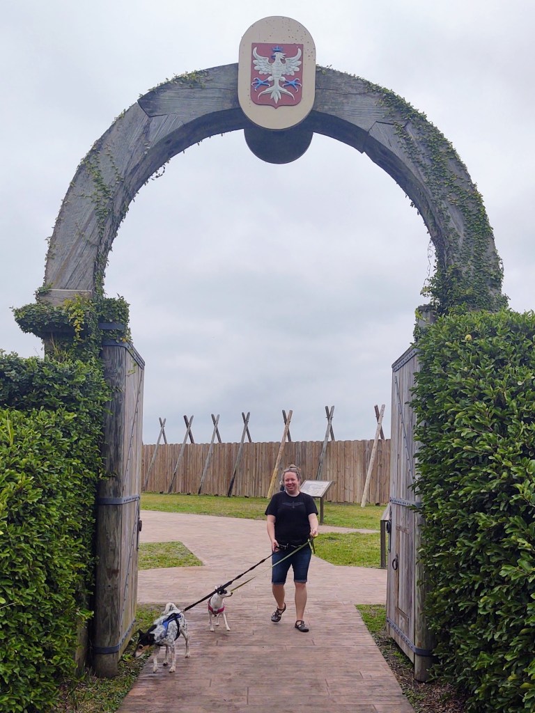 Hike review: Excellent! This site comprises both the Timucuan Reserve and the Fort Caroline National Memorial. Elements of both of these can be explored on the trails, including the local ecology, and reconstructions of the history. Trails were wide and gentle, with good variety of scenery. A few blind trail corners due to the dense forest and underbrush meant that we needed to stay alert for other dogs. At the outdoor interpretative center, there was the opportunity to learn about the Indigenous inhabitants, and their arts and engineering. Fascinating!
